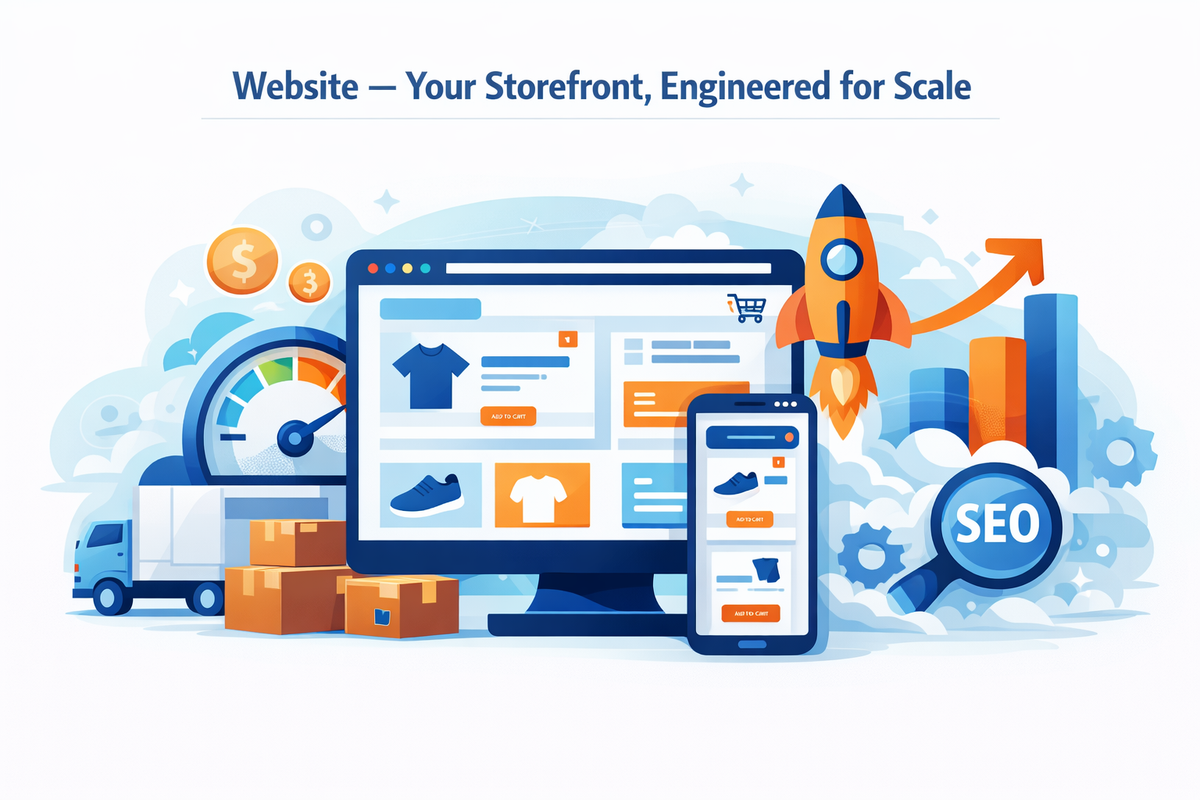 Website setup, ad accounts, campaigns, payment gateway & marketplace cataloging.